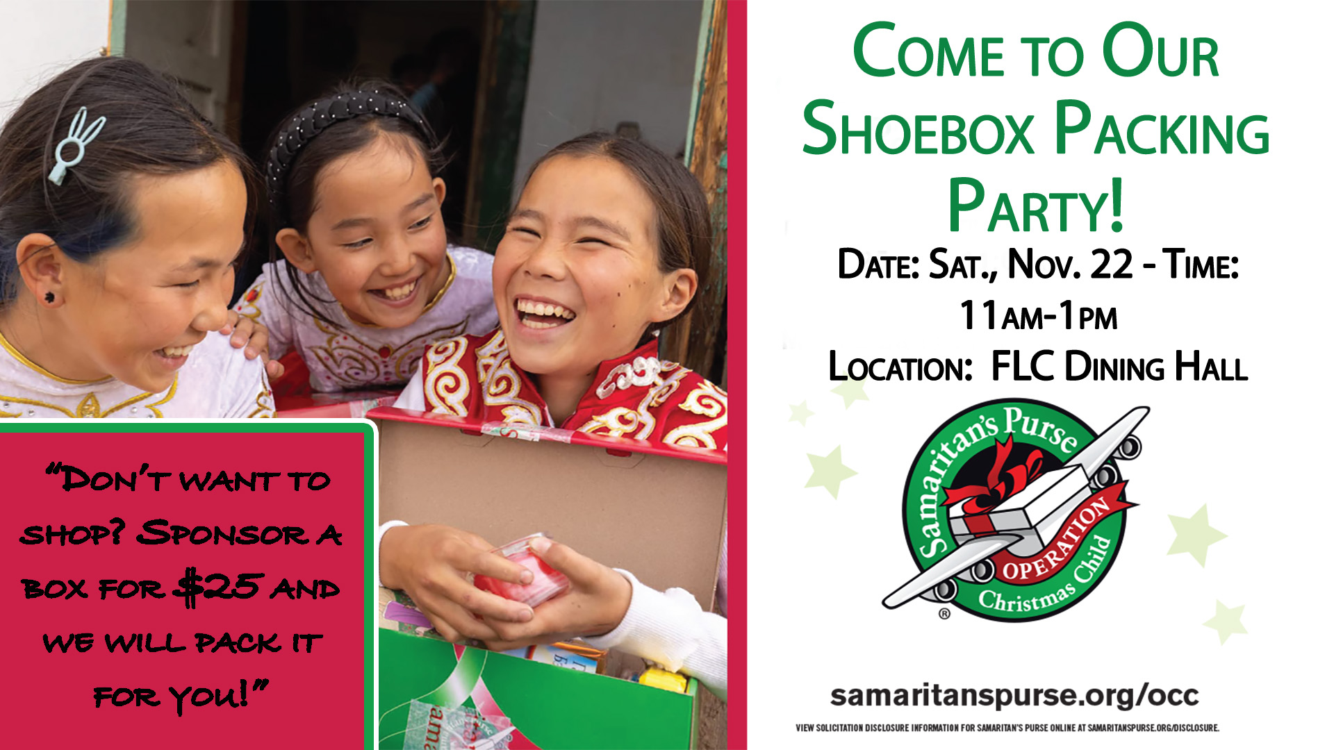 Volunteers are needed for the Operation Christmas Child Shoebox Packing Party on Saturday, Nov. 22, at 11 AM in the FLC Dining Hall. See Jaime Long or call the church office to volunteer.